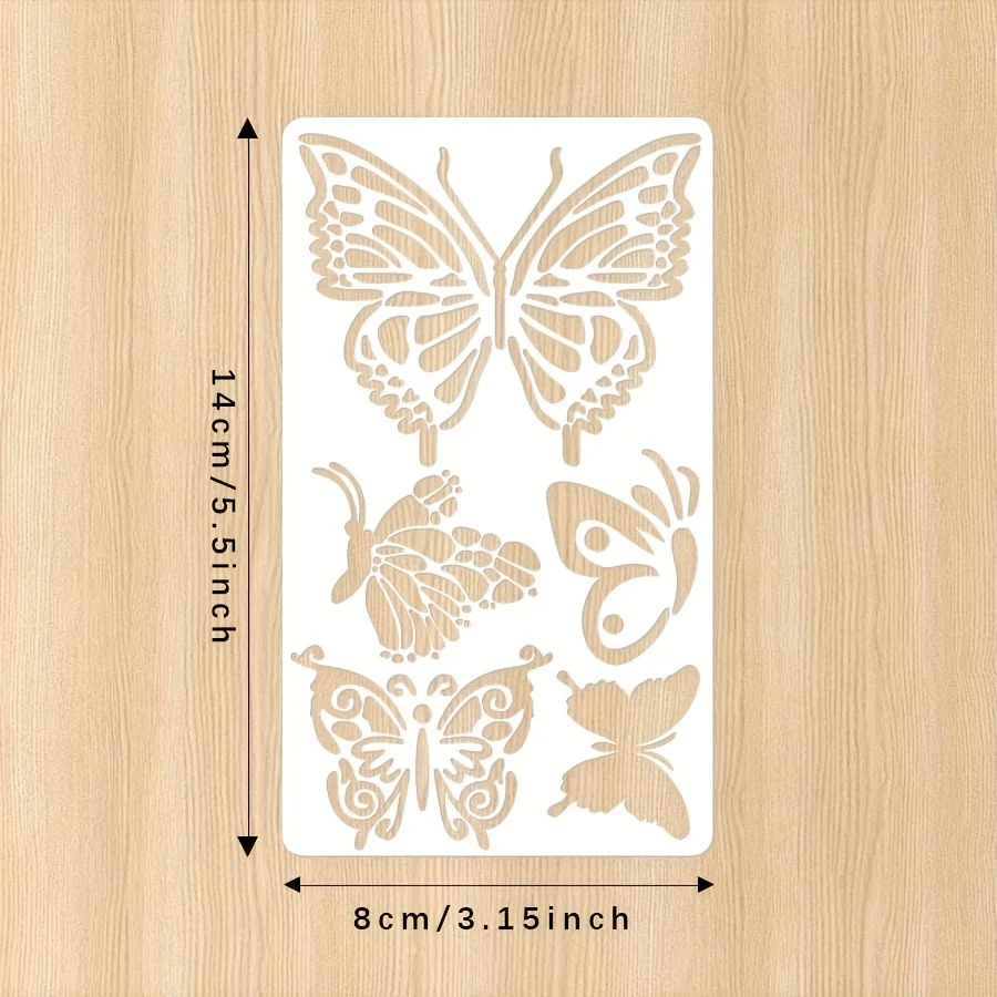 Add nature-inspired designs to your projects with this 6-piece stencil set featuring butterflies, flowers, and leaf patterns. Each stencil measures 3.15 x 5.5 inches and is made from durable, reusable plastic for easy tracing, painting, or spray art. Perfect for journaling, scrapbooking, wood painting, fabric décor, card making, and other creative DIY crafts.